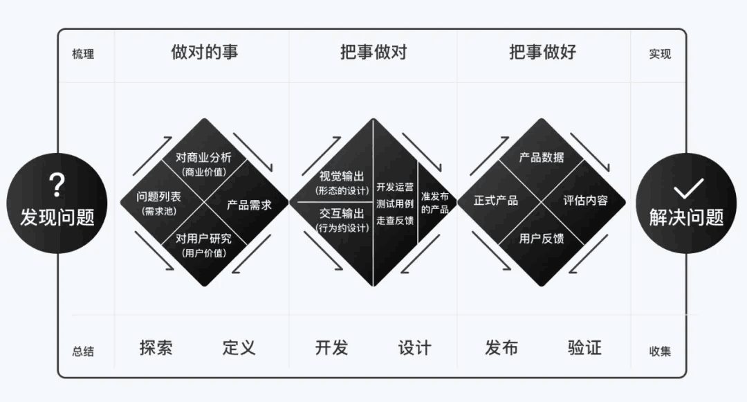 好的设计思路是需要一些客观的内容,感性(审美)结合理性(分析+理论)想出的最佳方案,这里推荐大家一个双钻模型,如下图所示: